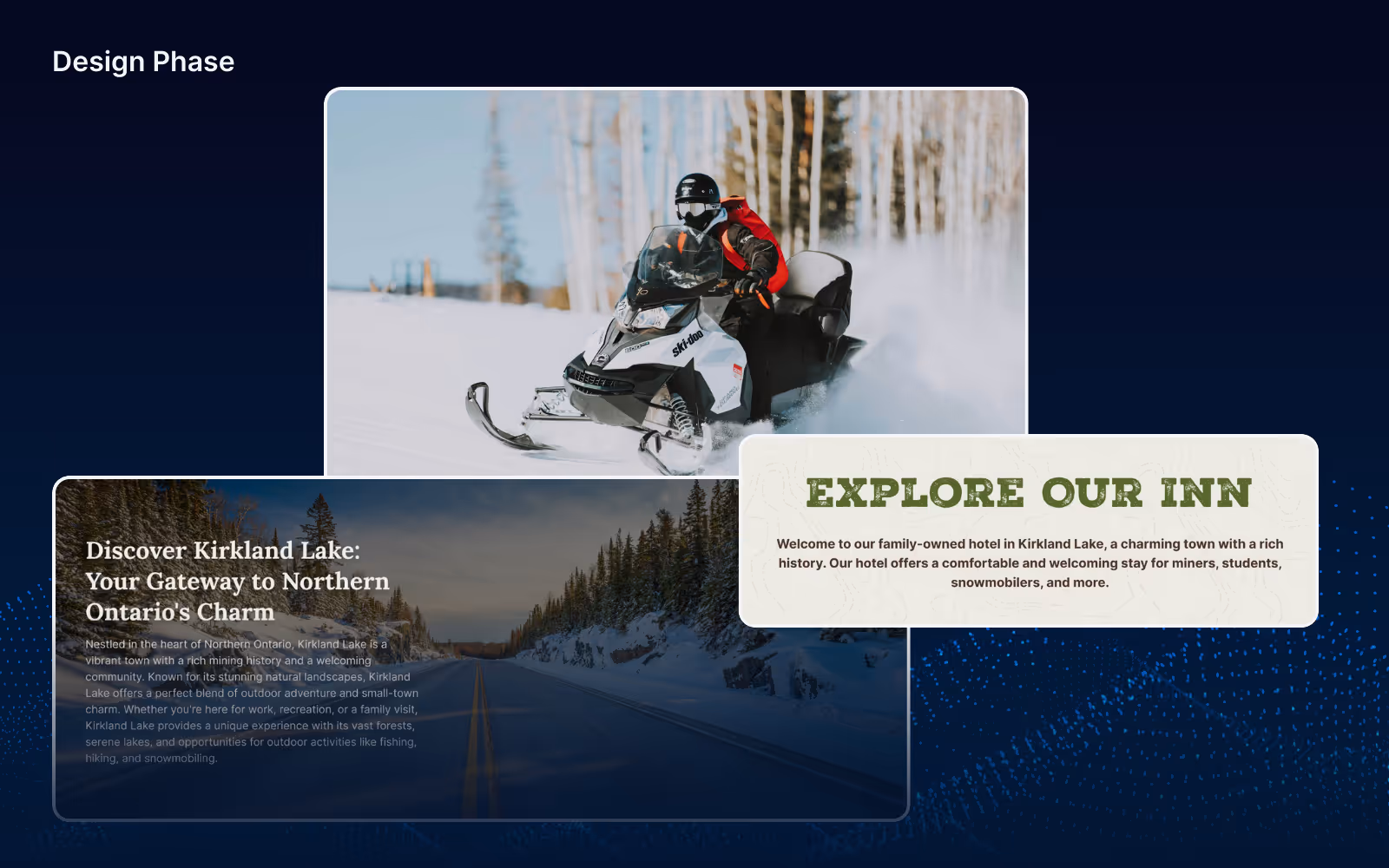 With the wireframes in place, we moved on to the design phase. The goal was to create an inviting and rustic aesthetic that resonated with the inn's target audience. We used warm colors, nature-inspired visuals, and rustic typography to capture the adventurous spirit of Kirkland Lake.