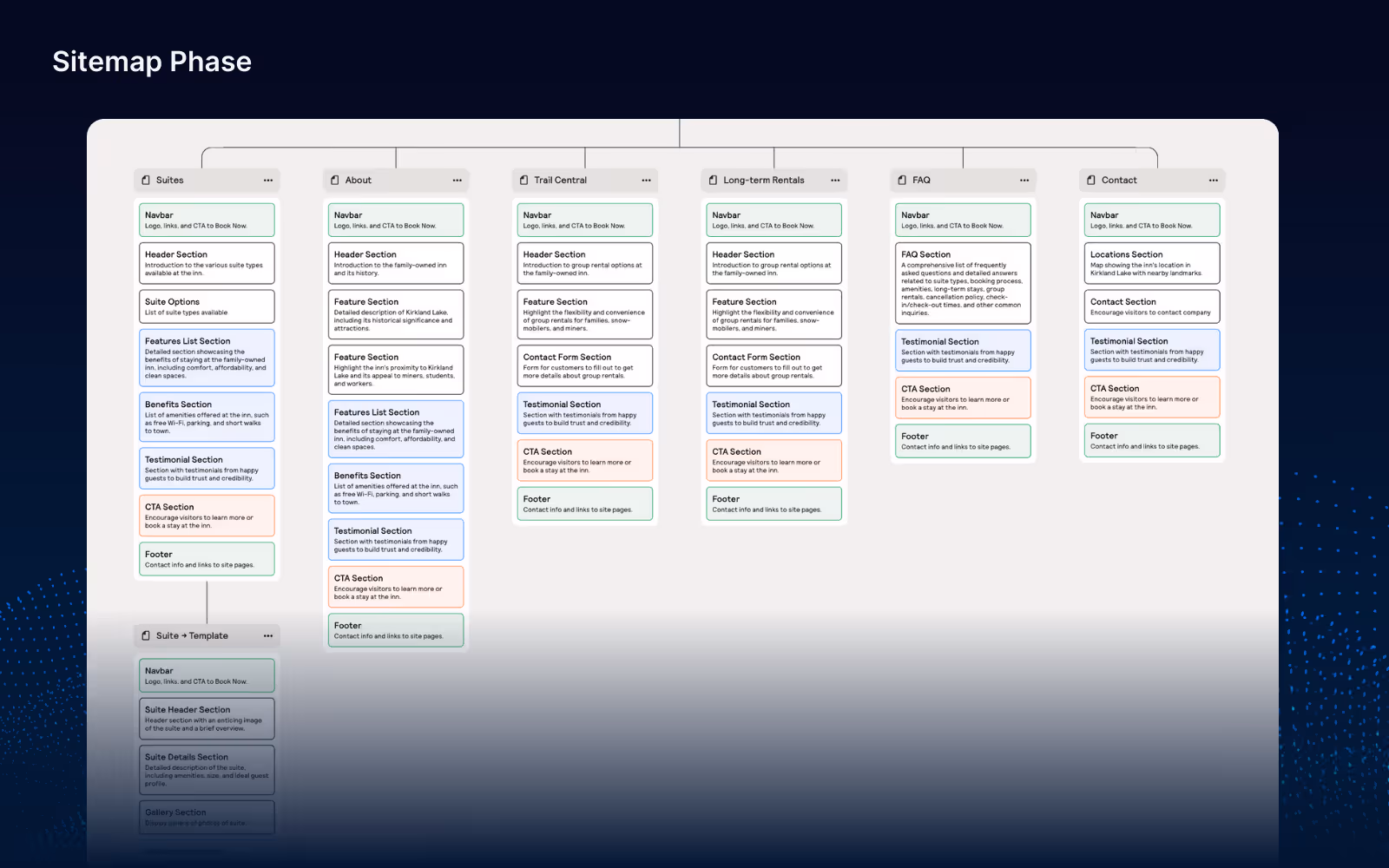 We began by creating a detailed sitemap to organize the content effectively. This helped ensure that all important information, such as amenities, rental options, and local activities, was easy to find for users.